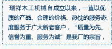 | 江蘇省東臺(tái)市瑞祥木工機(jī)械有限公司地處黃海之濱--東臺(tái)市安豐鎮(zhèn)大港村工業(yè)園內(nèi),由已破產(chǎn)的東臺(tái)巨輪木工機(jī)械公司銷(xiāo)售工程師李慶生先生和原單位生產(chǎn)骨干組成。 公司機(jī)械加工裝備成熟,檢測(cè)手段齊全。專(zhuān)業(yè)生產(chǎn)系列各型號(hào)旋切機(jī),氟塑料,塑料王--聚四氟乙烯(PTFE)專(zhuān)用旋切機(jī),木工帶鋸跑車(chē),大型臥式木工帶鋸,多片鋸和剝皮機(jī),單板烘干機(jī)。產(chǎn)品專(zhuān)業(yè)化,系列化,能滿(mǎn)足不同層次客戶(hù)的需求,實(shí)現(xiàn)雙方共同發(fā)展。 我們以坦實(shí),真誠(chéng)的合作精神,認(rèn)真負(fù)責(zé)的售后服務(wù)態(tài)度,不斷完善公司管理體系來(lái)贏(yíng)得廣大客戶(hù)的支持和信賴(lài)。 |